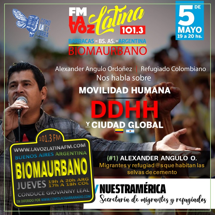 Hoy en BIOMAURBANO y COMO LA CIGARRA…RADIO, tenemos como invitado especial a Alexander Angulo, refugiado colombiano residente en Argentina, quien nos compartirá su experiencia como defensor de derechos de las poblaciones migrantes que habitan y transitan la gran urbe de Buenos Aires.