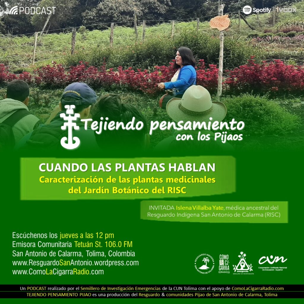 TEJIENDO PENSAMIENTO PIJAO | Una producción del Resguardo Indígena San Antonio de Calarma (RISC)ComoLaCigarraRadio.com | REALIZACIÓN: Semillero de Investigación Emergencias de la CUN Ragional Tolima, integrado por Alex Andrade Hernández, María Paula Romero Polanco, Milena Prada Yara, John James Cortes Buitrago, Mariangel Cardozo Torres y Andrés Felipe Ortiz Gordillo (docente). | EQUIPO DE EDUCOMUNICACIÓN E INVESTIGACIÓN RISC: Islena Villalba Yate (médica tradicional), Diana Isabel Villalba Yate, Adriana Guzmán Yate, Yadira Villalba Yate, Pedro Patiño Flores, Jerónimo Guzmán Guzmán, Diego Fernando Granados Vera, María Alexandra Villalba Olaya, Luisa María Olaya Salazar, Jesús Emilio Torres, Andrés Felipe Ortiz Gordillo. | PRODUCCIÓN: RISC y ComoLaCigarraRadio.com. | EDICIÓN: Sergio Torres Guzmán y Adriana Marcela Guzmán Yate. | LOCUCIÓN INCIDENTAL: Dolly Bernal | MÚSICA: Con mi tabaco (Shimshai & Susana, 2013); Canta un Pijao (Jorge Humberto Jiménez); Bunde Tolimense | SAN ANTONIO DE CALARMA, TOLIMA, 2023.