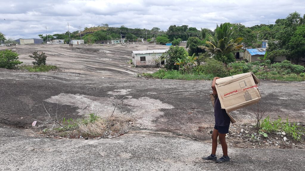 María Fernanda va camino a su casa. Se protege del sol con una caja. Foto: Madelen Simó Sulbarán.