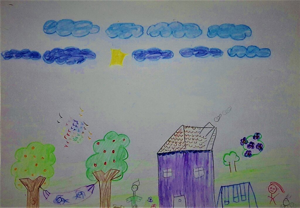 De colores, con pájaros y su chinchorro, así sueñan los niños su casa. Foto: Dibujo de Karen Rodríguez Ponare.