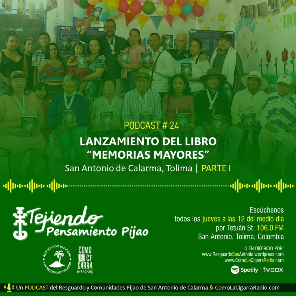 Vuelve el equipo de Tejiendo pensamiento Pijao con su caminar de la palabra en el municipio de San Antonio, Tolima. En esta oportunidad ComoLaCigarraRadio.com, el Resguardo Indígena San Antonio de Calarma y la Biblioteca Pública Municipal Germán Guzmán Campos los invitamos a escuchar la primera parte de la jornada de presentación del libro “Memorias Mayores. Relatos de lucha y re-existencia de mayoras y mayores campesinos e indígenas en San Antonio de Calarma (Tolima, Colombia)”, una publicación que busca recuperar relatos testimoniales para aportar a la memoria colectiva del municipio. Es una publicación con vocación comunitaria, que convoca las voces de las mayoras y los mayores, campesinos e indígenas, que habitan y son habitados por este territorio sanantoniano.
